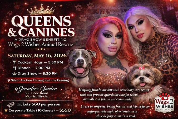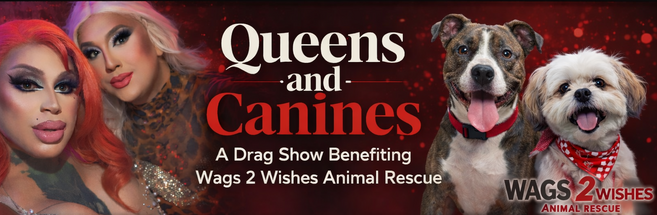Join us for Queens & Canines, a high-energy drag show fundraiser benefiting Wags 2 Wishes Animal Rescue and helping us finish our low-cost veterinary care center. This clinic will provide affordable veterinary care not only for rescue animals but also for pets throughout our community, ensuring more animals receive the medical care they deserve.
